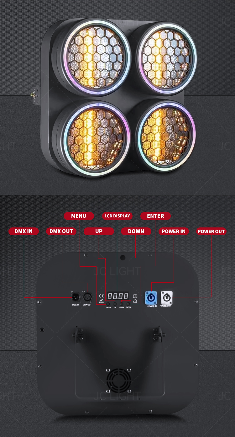 Light source: 4pcs*30w Amber, 8*4*4pcs 0.2w RGB, 124pcs*0.2w RGB lamp beads