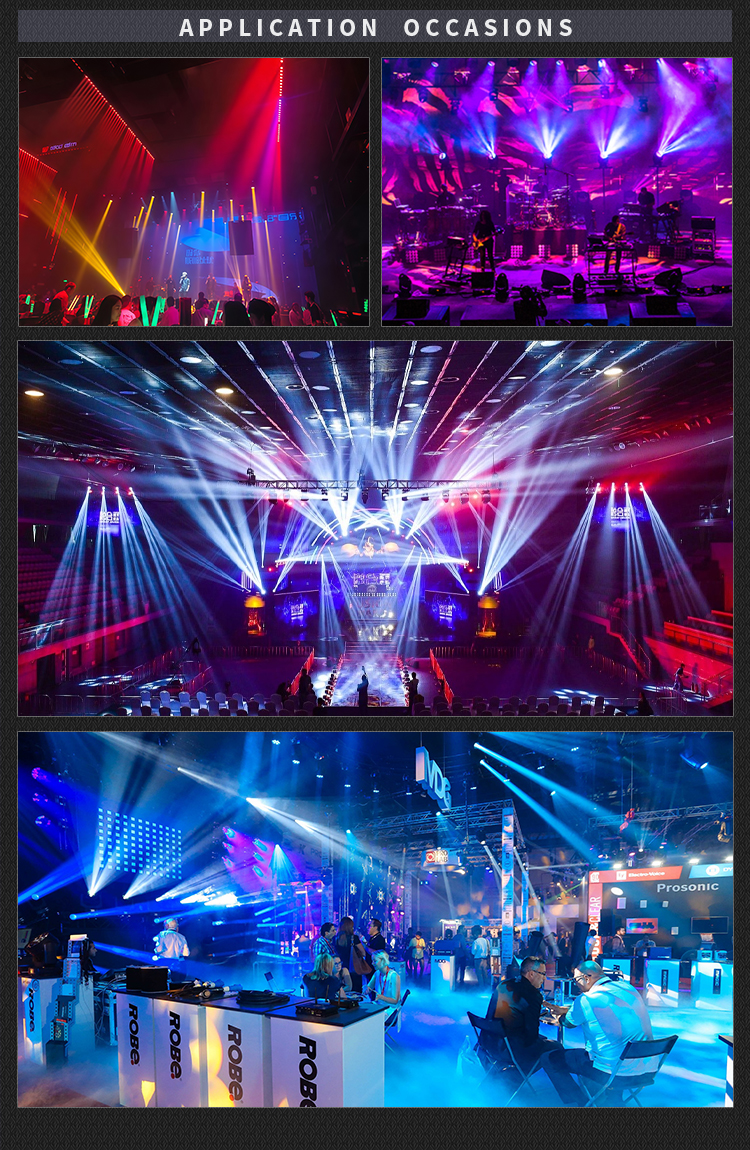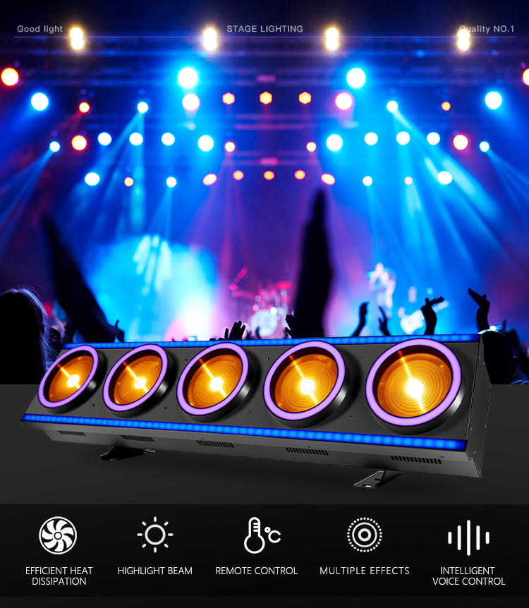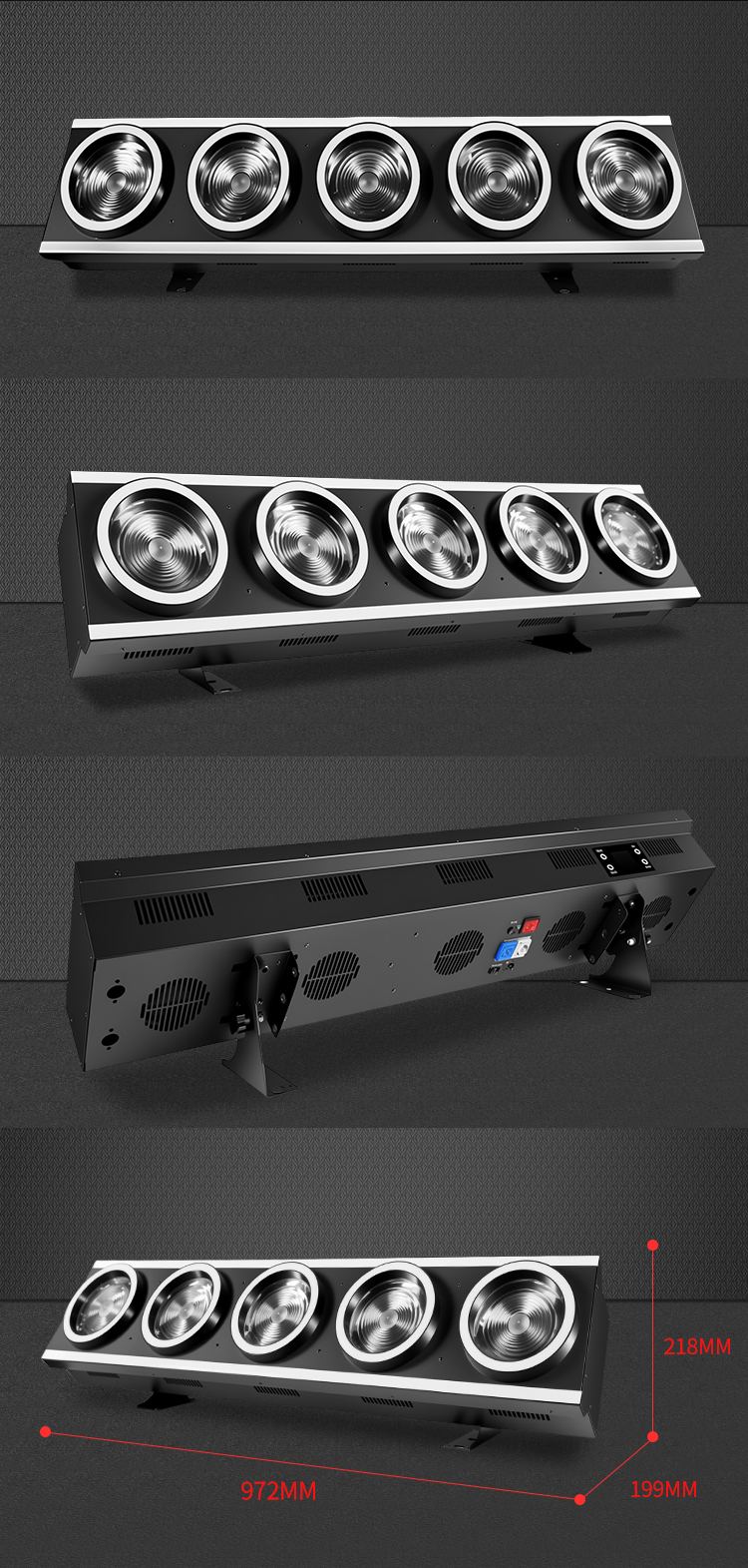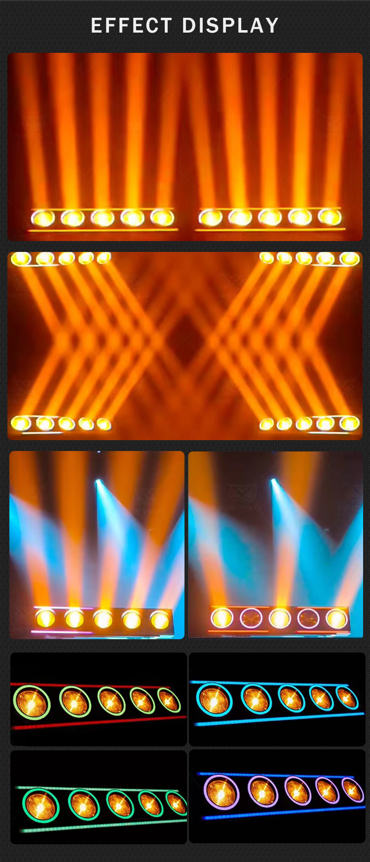 Light source: 5*150W LED golden yellow, auxiliary light: Aperture: 5* 32*0.2W RGB, light strip: 2*57*0.2W RGB