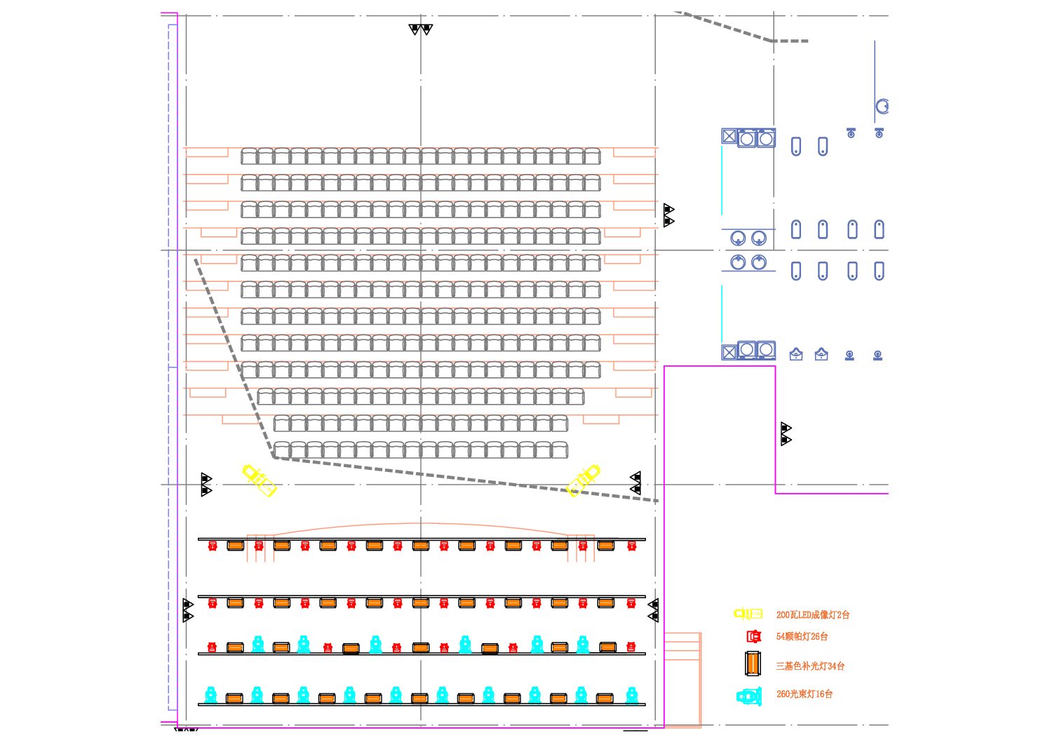 • Proficient in using CAD to create corresponding lighting design plans according to customer sites, including lighting positions, console controller distribution, truss layout, DMX line distribution, power line distribution, reasonable distribution of light effects, etc.