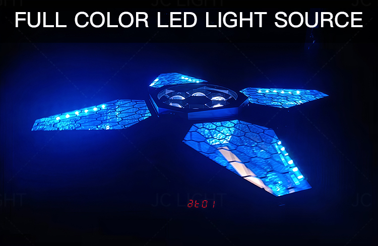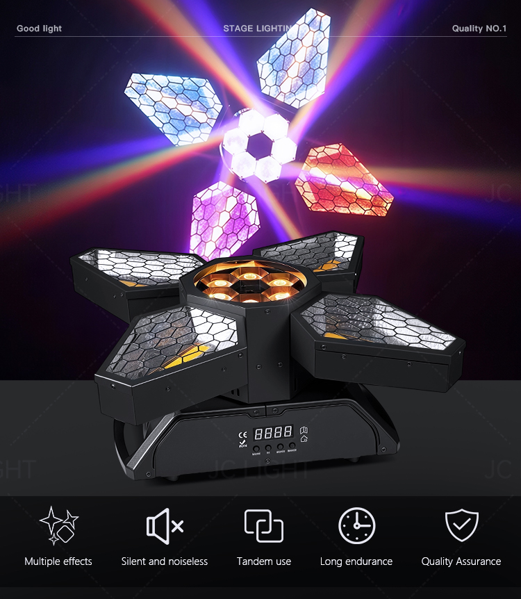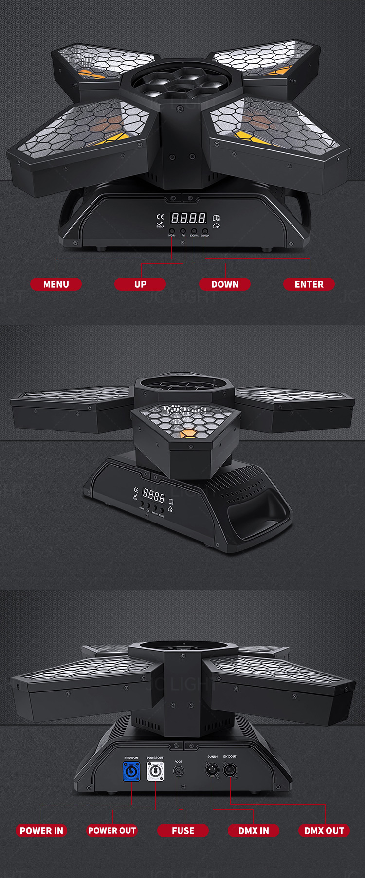 Light source: 4pcs*60W golden, 48pcs*3w 3535 RGB 3in1 LED beads,6pcs 12W RGBW 4in1 bee eye LED beads