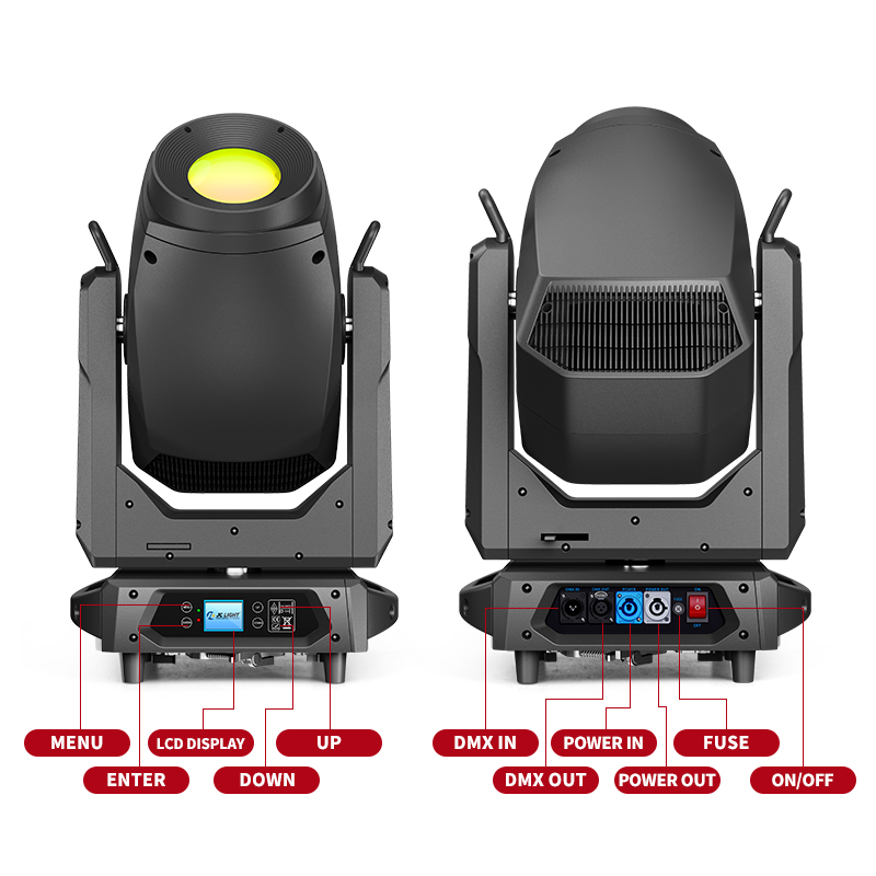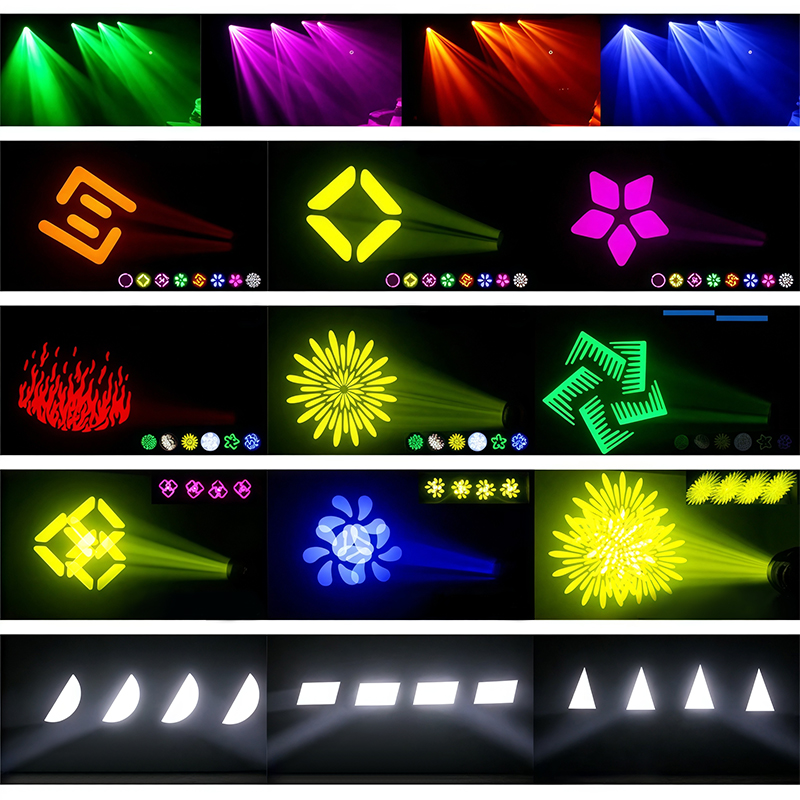 Prism: 1 rotating 4 prism +4-row prism, both can rotate in either direction, prism can be overlay and positioning., can bi-directional rotating, with marco function, prism can be overlay to make rich beam effect.
