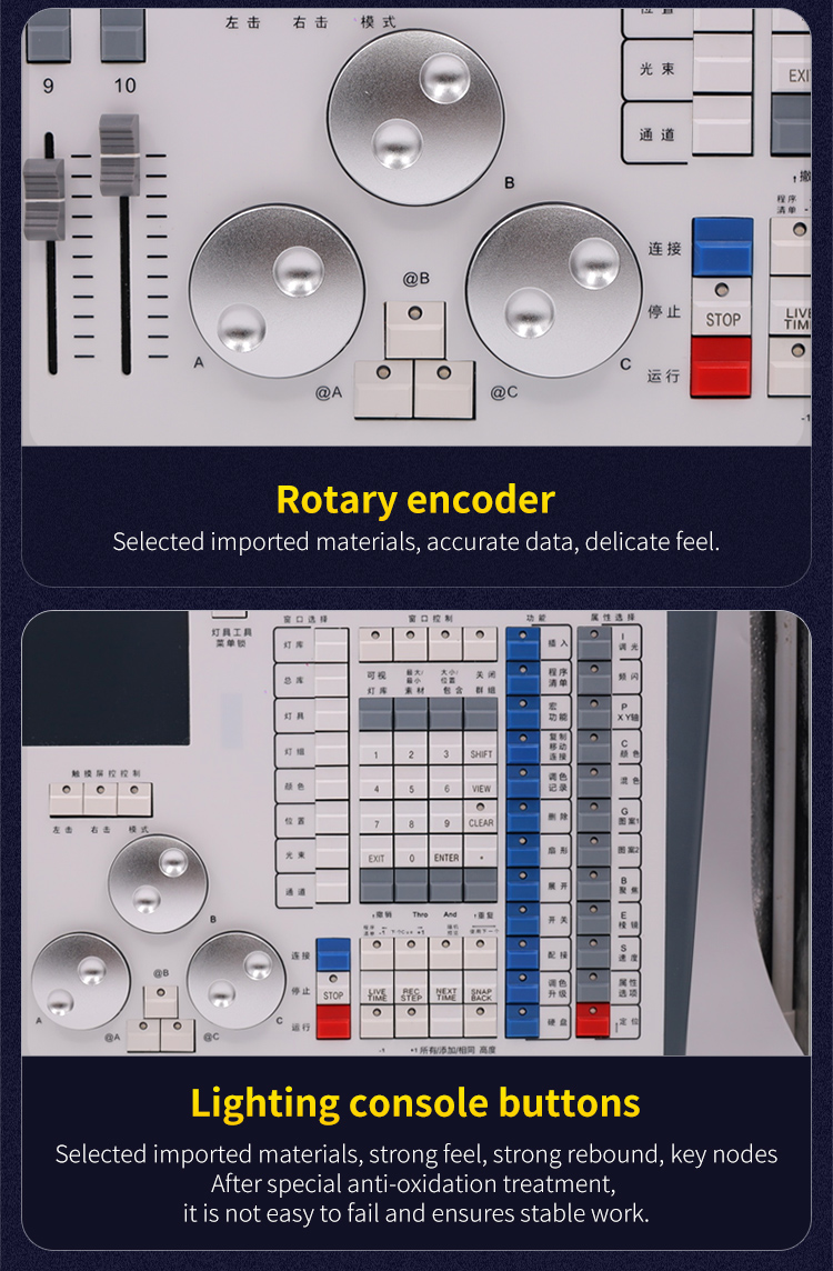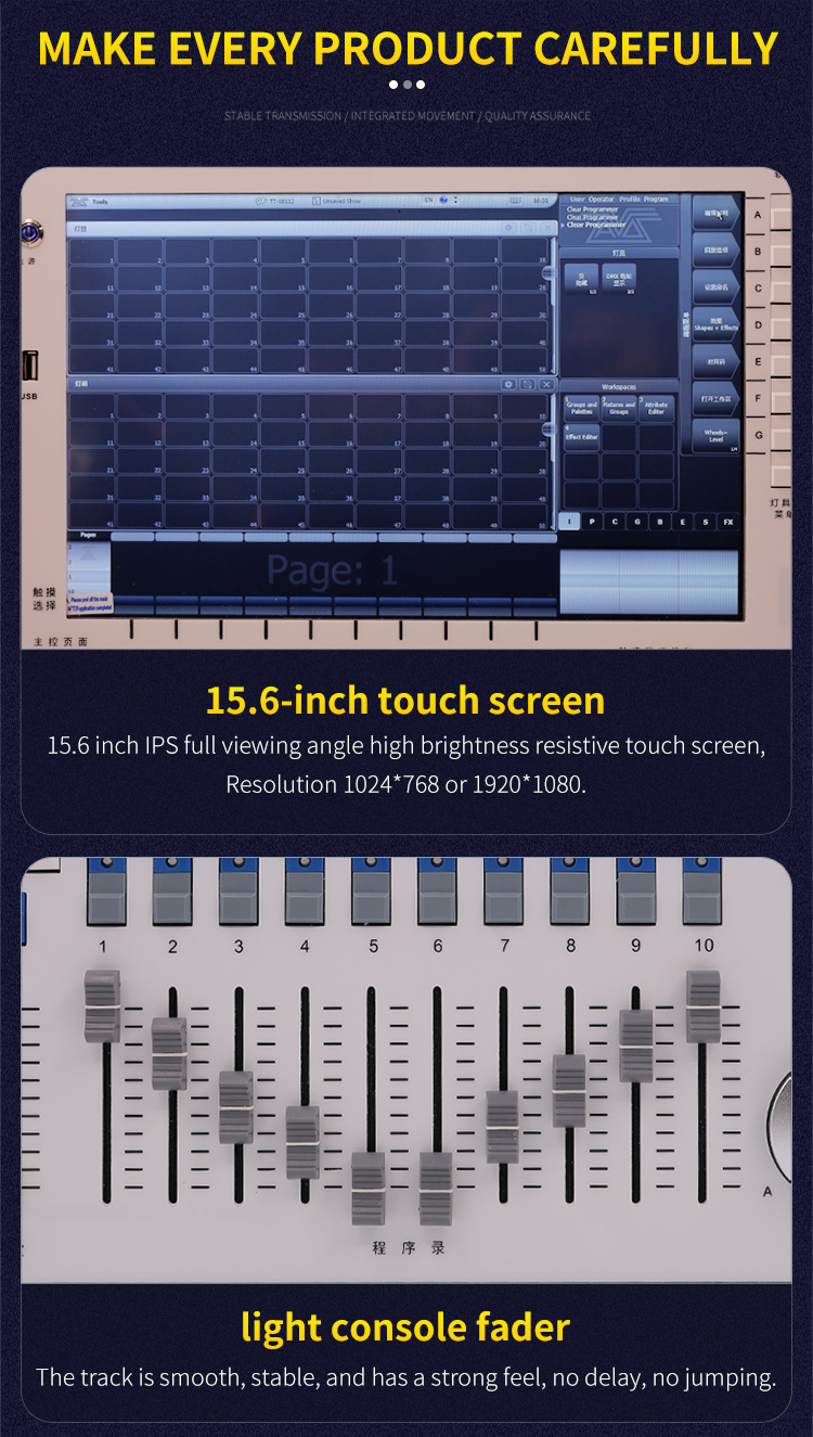 The console comes with 8/12 DMX outputs,6144 channels and supports expansion to 64 DMXs.