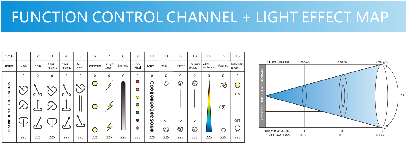 Focus: Electric focus, beam Angle 2.8 ~ 38°